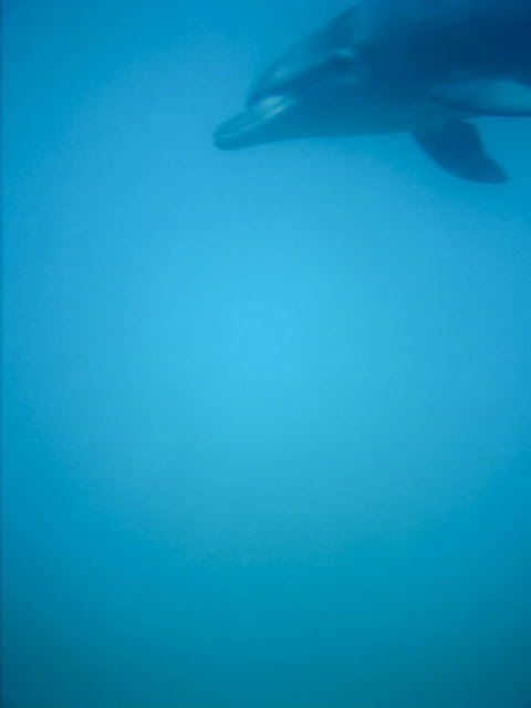 Pia on a visit from Italy. First the big group of dolphins passes, and later a group of four very young individuals. Four means play... they stayed for at least 45 min circling us, going and returning, and checking us out. During our encounter the four dolphins were much at ease. They communicated between each other with whistling sounds which they usually stop when intruders are around. At the end the adults of the pod pick them up and they leave.